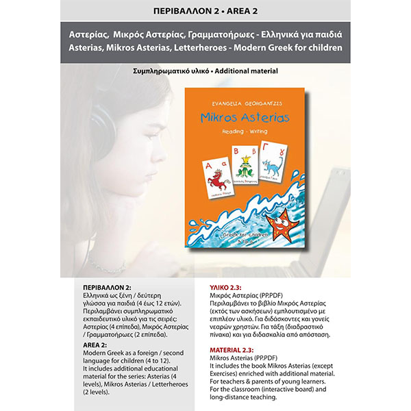In parallel children develop reading and writing skills that are key objectives of this book. Mikros Asterias contains a basic material that prepares children to continue with the Asterias series, having built sound foundations in reading, writing, pronunciation and accentuation skills.