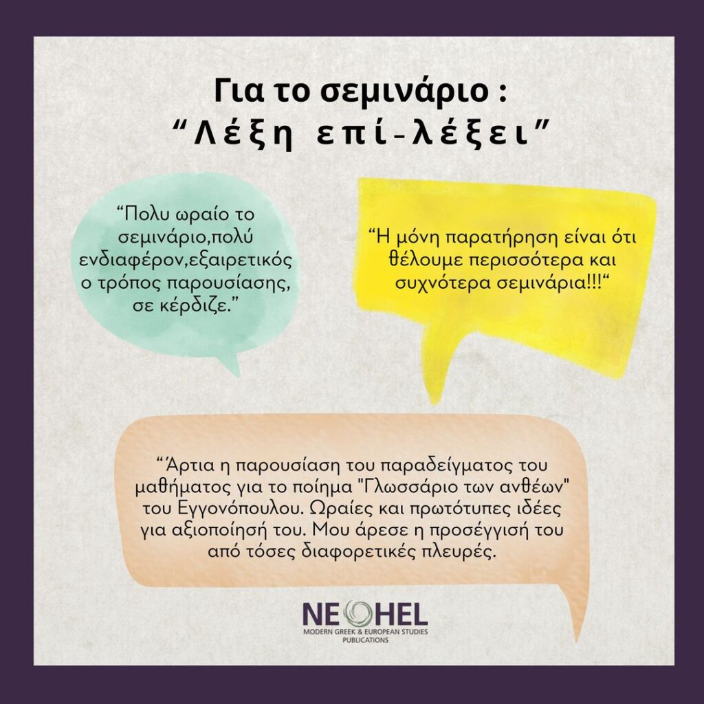 «Λέξη Επί-λέξει» 21/3/23 Το σεμινάριο απευθύνεται σε διδάσκουσες και διδάσκοντες την Ελληνική ως Ξένη Γλώσσα. Πώς ένα ποίημα του Νίκου Εγγονόπουλου μπορεί να αποτελέσει αφορμή για να γράψουν ενήλικοι σπουδαστές της Ελληνικής Γλώσσας τα δικά τους ποιήματα; Πώς αξιοποιούνται διδακτικά τα στοιχεία της ελληνικής παράδοσης και οι μύθοι που εμπεριέχονται στο ποίημα «Το γλωσσάριο των ανθέων» του Νίκου Εγγονόπουλου.