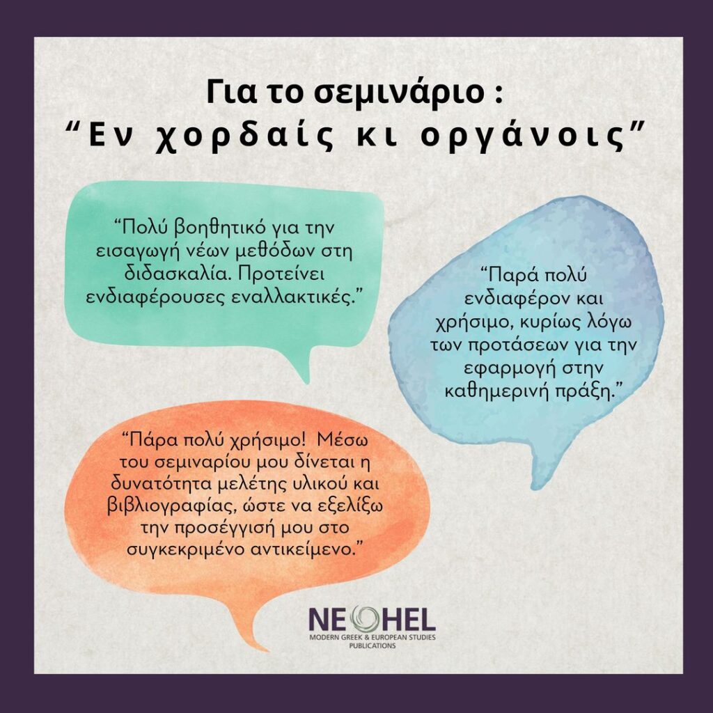 «Εν χορδαίς κι οργάνοις» 27/5/23 Το σεμινάριο απευθύνεται σε εκπαιδευτικούς που διδάσκουν την Ελληνική ως δεύτερη/ ξένη γλώσσα και επιθυμούν να αξιοποιήσουν το καραόκε και τον χορό στη διδασκαλία τους.
