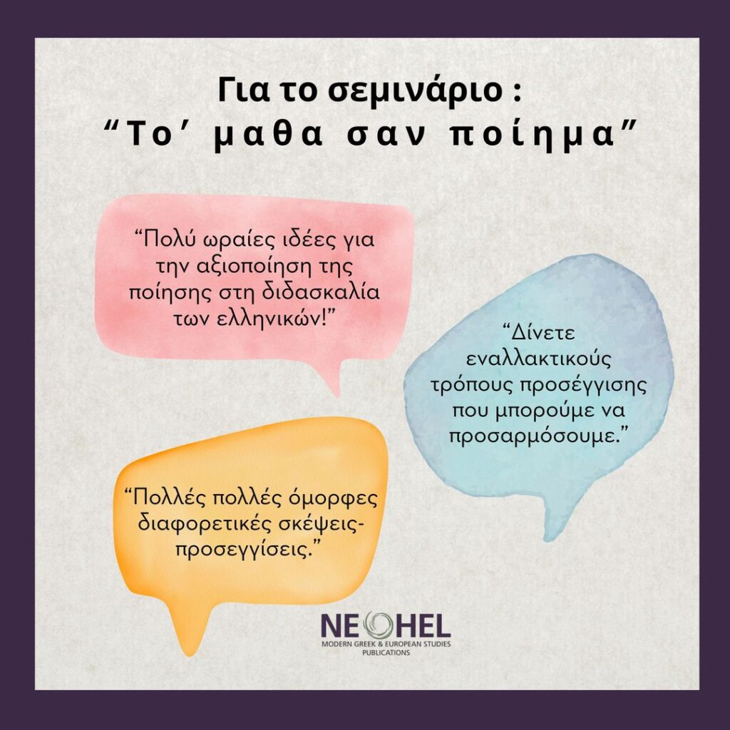«Το ‘μαθα σαν ποίημα» 2/6/23 Το σεμινάριο απευθύνεται σε εκπαιδευτικούς που διδάσκουν σε παιδιά. Αν είστε από τους/τις εκπαιδευτικούς που αναζητούν δημιουργικούς τρόπους και διαφορετικά μέσα για να αξιοποιήσουν στη διδασκαλία τους, μη χάνετε χρόνο και παρακολουθήστε αυτό το σεμινάριο! Θα δείτε παραδείγματα αξιοποίησης ποιημάτων και θα πάρετε πολλές ιδέες για δραστηριότητες που βασίζονται σε ποιήματα.