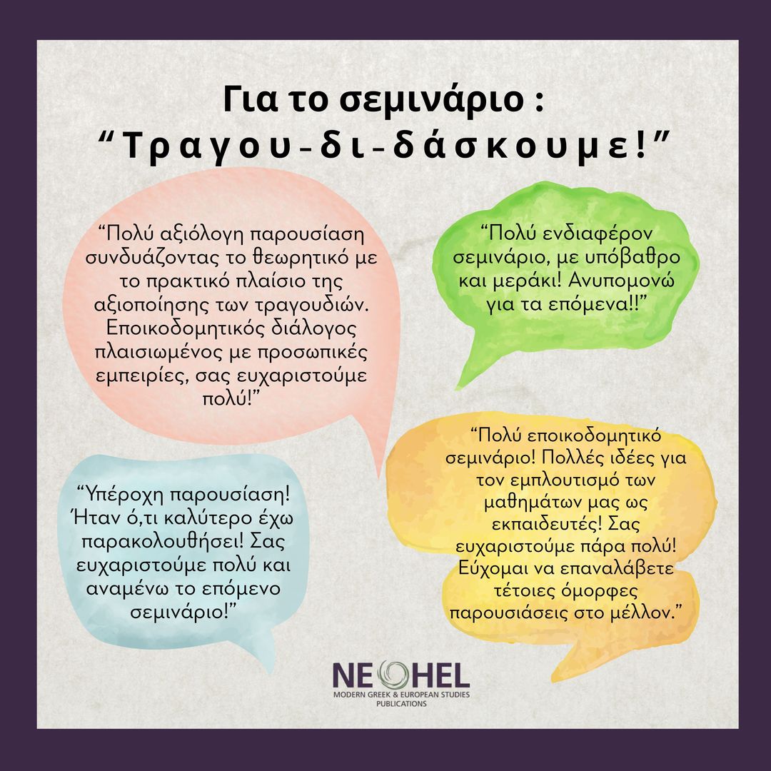 «Τραγου-δι-δάσκουμε» 9/2/23 Η παρουσίαση-σεμινάριο απευθύνεται σε εκπαιδευτικούς που διδάσκουν την Ελληνική ως δεύτερη/ ξένη γλώσσα και επιθυμούν να αξιοποιήσουν το τραγούδι στη διδασκαλία τους. Ποια είναι τα οφέλη από την αξιοποίηση των τραγουδιών στη γλωσσική διδασκαλία; Με ποια κριτήρια επιλέγω ένα τραγούδι για διδακτική αξιοποίηση; Στο εν λόγω σεμινάριο βρίσκετε πρακτικές ιδέες και λύσεις.