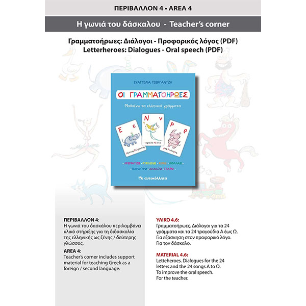 Development of the oral speech in parallel with the learning of the letters of the Greek Alphabet and the corresponding songs. It includes vocabularies, communication objectives for each Letterhero and thematic vocabularies at the end of each unit. The second part of the material includes cultural elements about Greek customs and holidays. A companion to the book: Letterheroes.